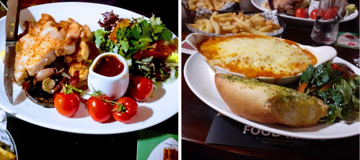 Must-try dishes include the Beer Battered Cod Fillet and the 10oz Rump or Rib-Eye Steak. For starters, the Home Made Soup and Breaded Mushrooms shine.